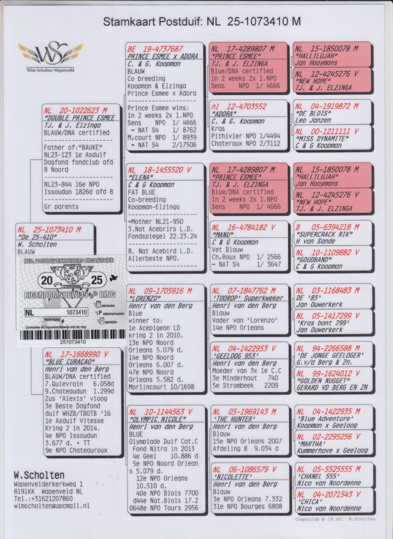 Uit: ”Double Prince Esmee”, vader ”Bouke”, 1. Prov. Noord Asduif Dagfond, uit zoon & dochter ”Prince Esmee” x ”Blue Curacao”, 7. Quiévrain 6.058 d., 9. Chateaudun 1.299 d., zus ”Alexis”, 3. Nat. Asduif Dagfond WHZB