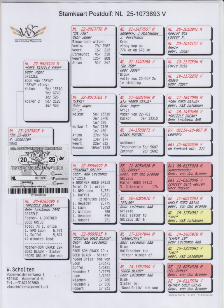 Uit: ”Grey Triple Four”, zoon ”Arya”, 1.-450 d., 5.-2.126 d., 1.-326 d., 5.-13.310 d., inteelt ”Goed Grijs” x ”Grizzle Zarka”, uit 1/2 broer ”Goed Grijs”, 7x 1 Prijs & 1. NPO Laon 6.371 d., nazaten winnen 7x 1. Nat. Asduif
