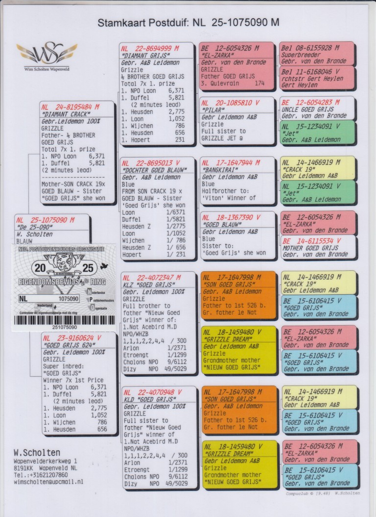 Uit: ”Diamant Crack”, uit 1/2 broer ”Goed Grijs”, 7x 1. Prijs & 1. NPO Laon 6.371 d, nazaten winnen 7x 1. Nat. Asduif x ”Goed Grijs 624”, uit zoon & dochter ”Son Goed Grijs 998”, gr-vader 1. Nat. Asduif Midfond NPO