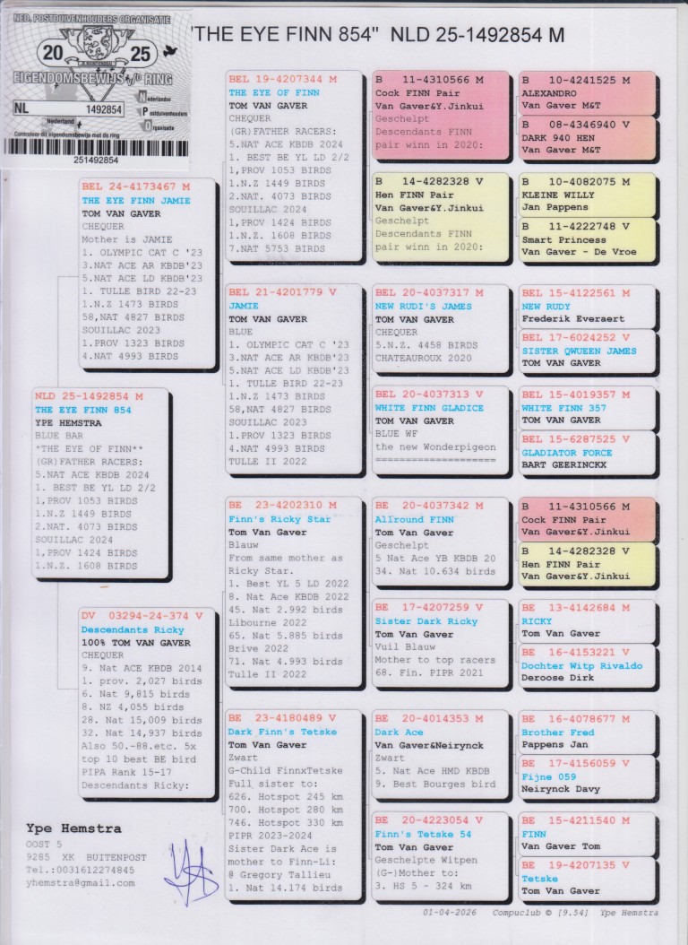 Uit: ”The Eye Finn Jamie”, zoon ”The Eye of Finn”, (Gr) vader 1. Nat. Asduif Fond België, zoon ”Jamie”, 1. Olympiade duif, 3. & 5. Nat. Asduif KBDB x ”Decandants Ricky”, dtr. ”Finn’s Ricky Star” & ”Dark Finn’s Tetske”