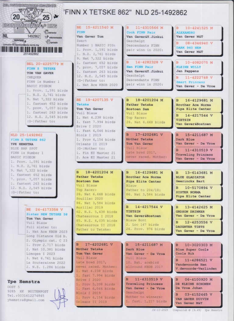 Uit: ”Finn’s Tetske”, zoon ”Finn”, Stamvader Tom van Gaver & ”Tetske”, 1. Nat. Brive, 1. Prov. Blois, 1. Prov. Orleans x ”Sister New Tetske 58”, zus ”New Tetske”, 1. Nat. Asduif Fond KBDB, zus ”Tetske”, Unieke duif