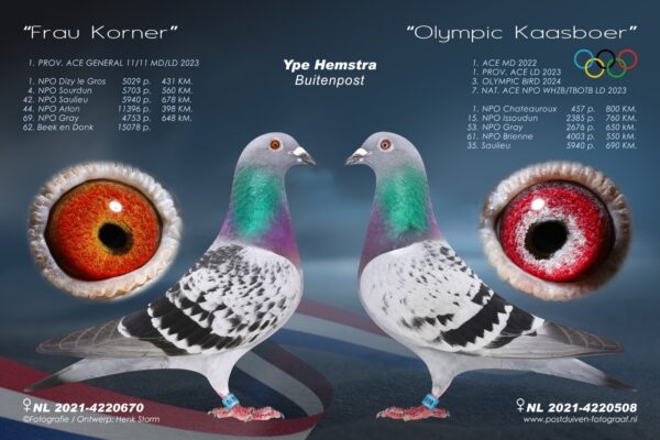 In deze veiling hebben we te maken met het beste van het Gebr. Leideman & PIPA Breeding soort via Ype Hemstra, de Nationaal Duifkampioen Midfond NPO 2023 (op hok Hemstra, St. Jansklooster) en 3. Olympiade duif Fond in Maastricht 2024 (behaald in Buitenpost)