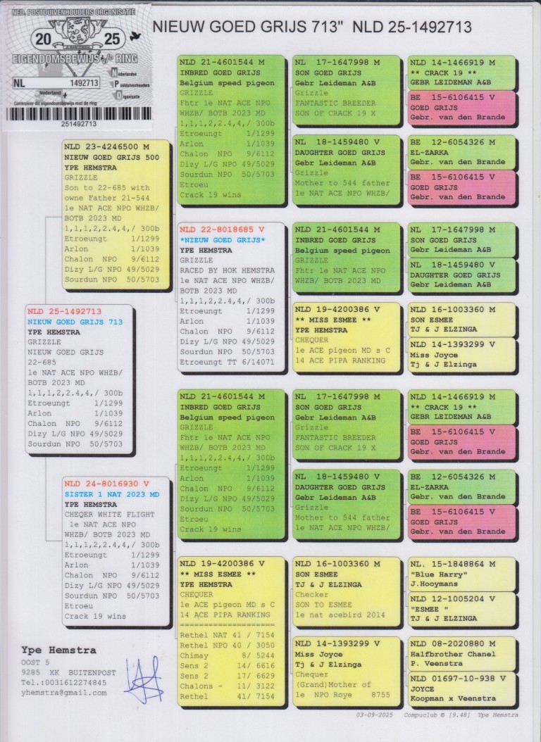 “Nieuw Goed Grijs 713”, uit “New Goed Grijs 500”, uit zoon & dochter “Goed Grijs” & “Nieuw Goed Grijs”, 1. Nat. Asduif NPO/WHZB !!! x “Sister 1. Nat. NPO/WHZB”, 1.-1.299d., 1.-1.039d., 9.-6.112d., uit “Inbred Goed Grijs” & “Miss Esmee”, Tj. & J. Elzinga !!!!!!!!!!!!!!!!!!