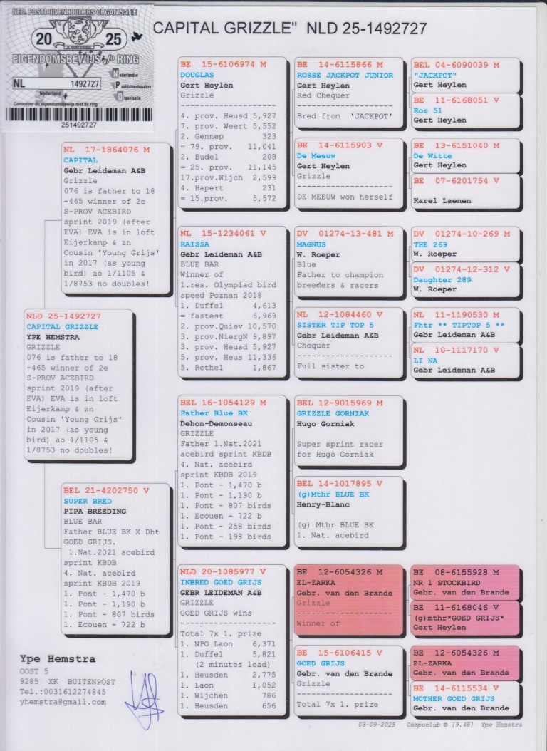 “Capital Grizzle”, dochter “Capital”, vader 2. Prov. Asduif, uit “Douglas”, 4.-5.927d., 7.-5.552d. & “Raissa”, 1. Res. Olymp.Duif, uit “Magnus & Sister Tip Top 5” x “Super Bred 750”, uit “Father Blue BK”, 1.+4. Nat. Asduif KBDB & dochter “El-Zarka & Goed Grijs”.