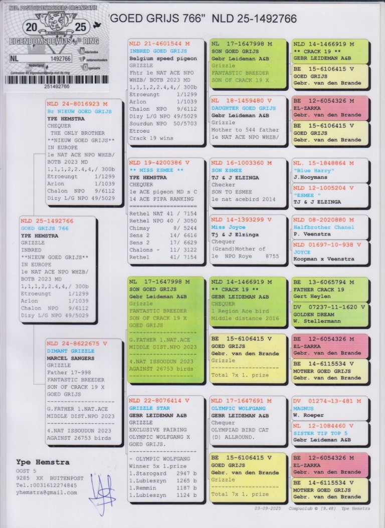 “Goed Grijs 766”, uit “Brother Nieuw Goed Grijs”, 1. Nat. Asduif NPO/WHZB, 1.-1.299d., 1.-1.039d., 9.-6.112d., zoon “Inbred Goed Grijs” & “Miss Esmee”, Tj. & J. Elzinga x “Dimant Grizzle”, uit “Son Goed Grijs 998”, gr.vader 1. Nat. Asduif NPO/WHZB & “Grizzle Star” !!!!!!!!!!!!!!!!!!!!