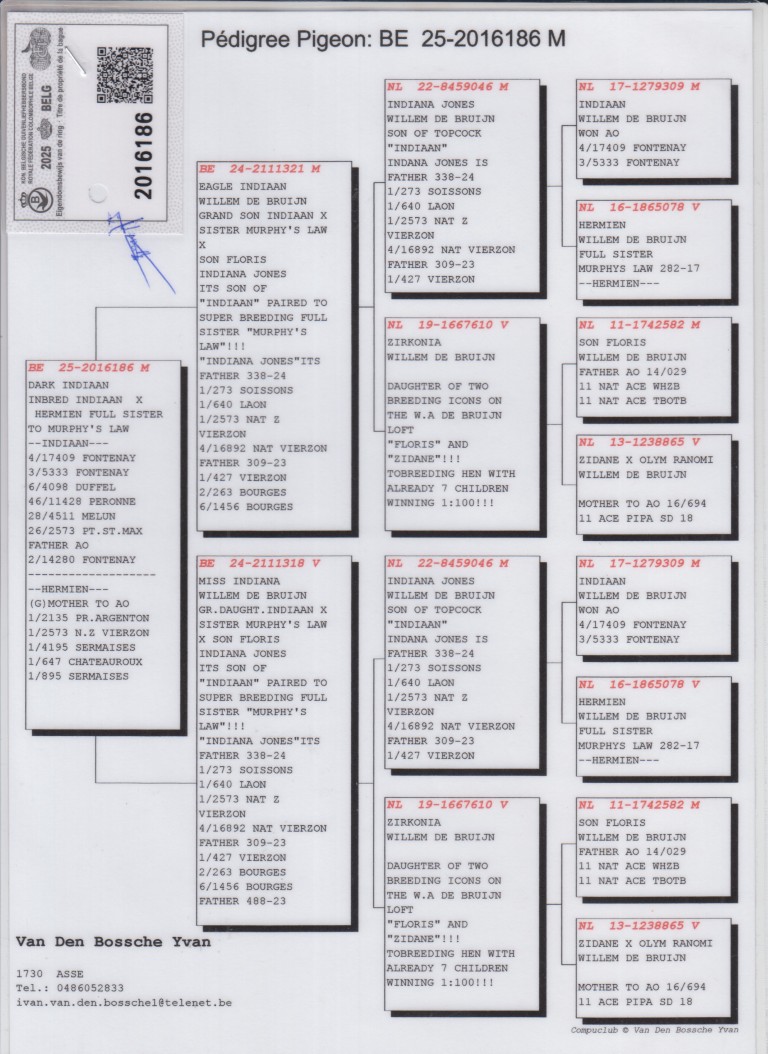 Uit: ”Eagle Indiaan”, lijn ”Murphy’s Law”, 2x 1. Nat. Asduif, nazaten winnen: 6x 1. Nat. Asduif x ”Miss Indiana”, lijn ”Murphy’s Law”, 2x 1. Nat. Asduif, nazaten winnen: 6x 1. Nat. Asduif, uit kld. ”Olympic Ranomi”