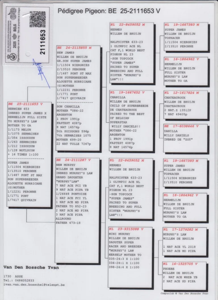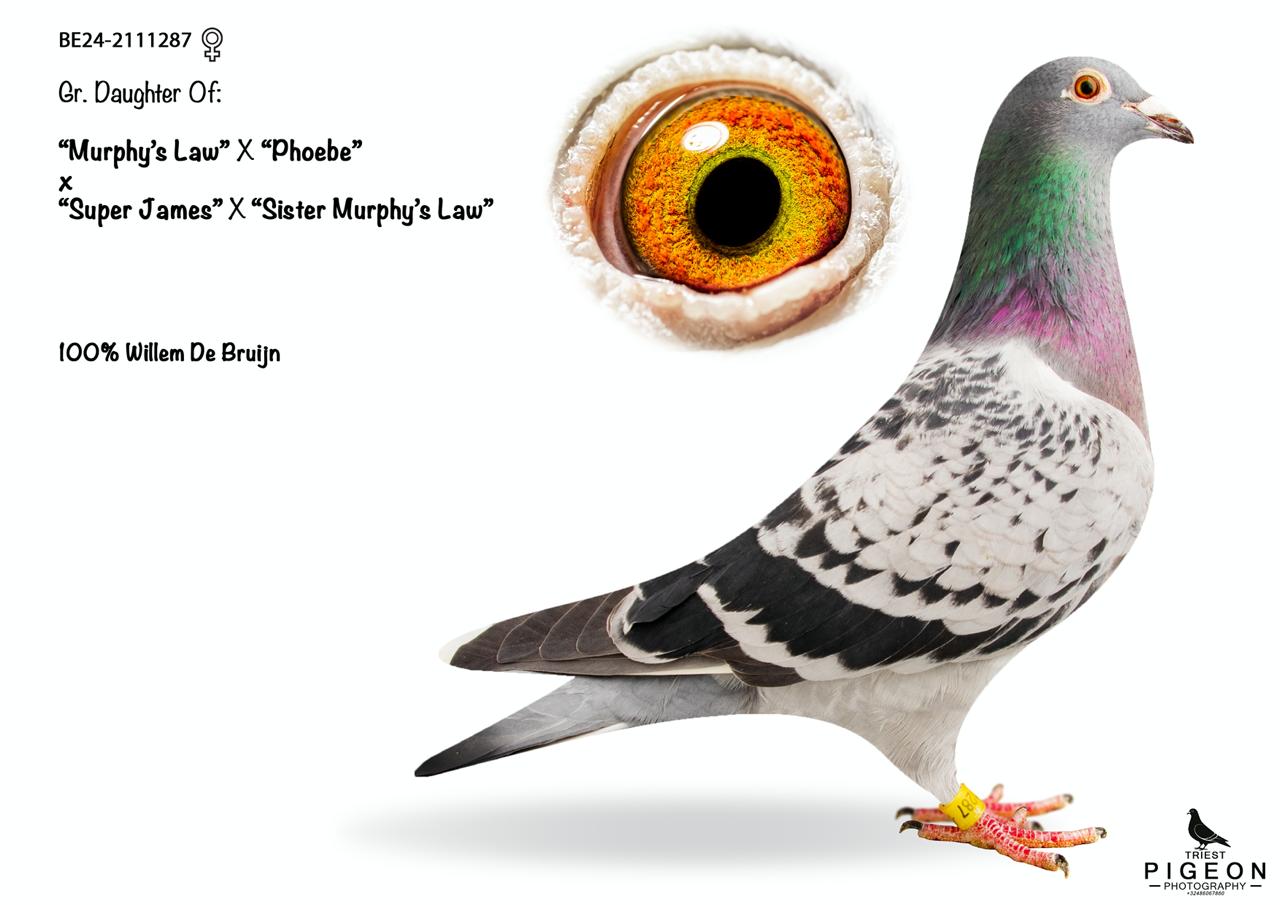 Uit: ”New James”, uit zoon ”Super James”, 1.-11.504 d., 1.-1.487 d., 2.-13.510 d. x ”New Murphy”, uit dtr. ”Murphy’s Law”, 2x 1. Nat. Asduif, nazaten: 6x 1. Nat. Asduif & 25x top 10 Nat. Asduif & ”Phoebe”, 2. Nat. Asduif