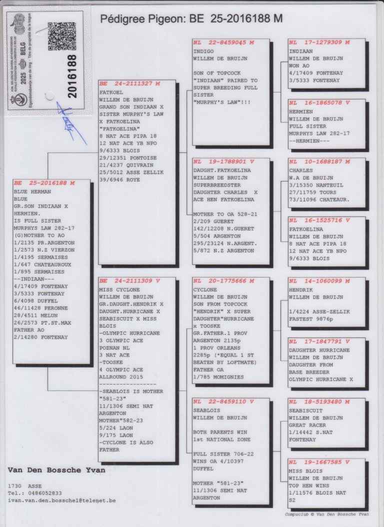 Uit: ”Fatkoel”, lijn ”Murphy’s Law”, 2x 1. Nat. Asduif & legendarische kweker x ”Miss Cyclone”, uit klz. ”Olympic Hurricane”, Olympiade duif Cat. Jonge Duiven, uit dochter ”Seabiscuit”, 1. Nat. Sector Fontenay 14.442 d.