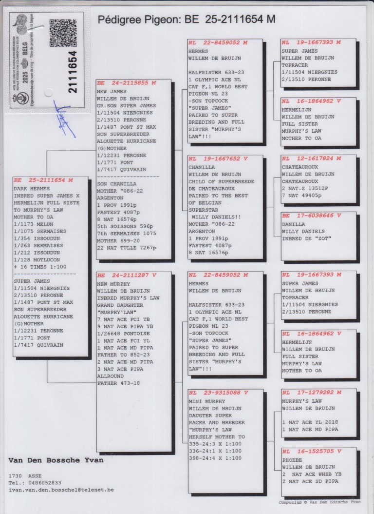 Uit: ”New James”, uit 1/2 broer ”Olympic Pure Gold” 1. Olympiade duif Cat. Jonge, lijn ”Murphy’s Law” x ”Miss Murphy”, uit dochter ”Murphy’s Law”, 2x 1. Nat. Asduif, nazaten: 6x 1. Nat. Asduif & 25x top 10 Nat. Asduif