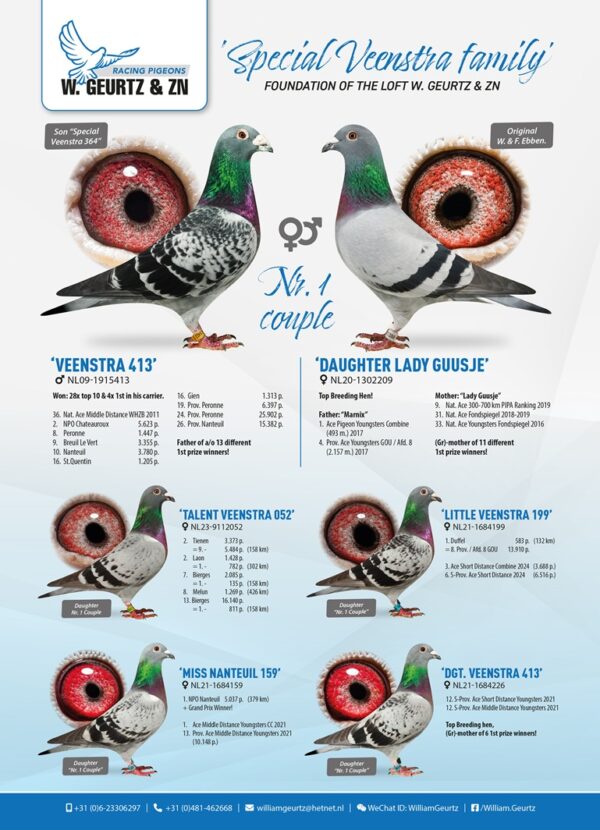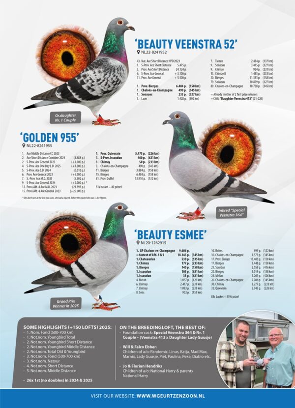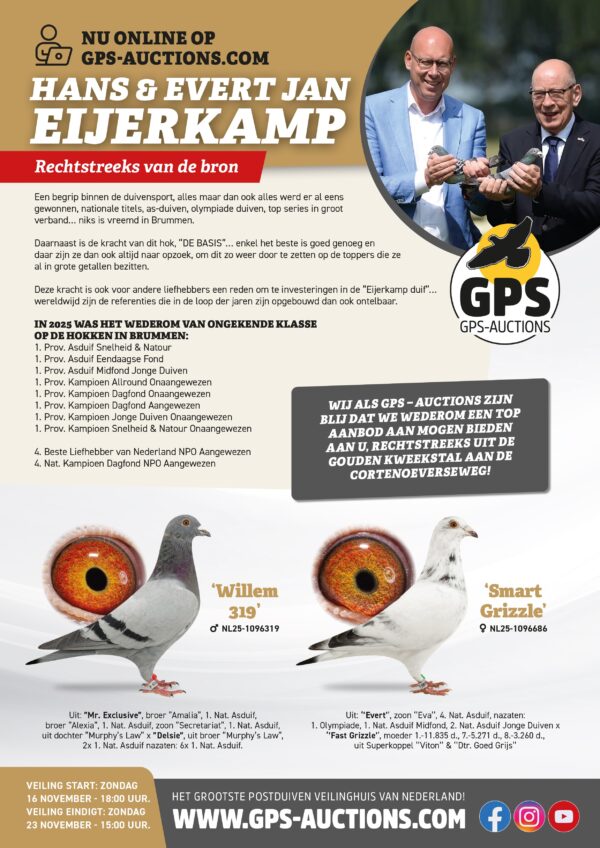 基本信息: 鸽子已被仔细观察过,但可能…… 不提供100%保证 鸽子性别已正确标注。——拍卖结束后,鸽子将留在哈尔德伦的鸽舍中,所有鸽子都已接受过驱虫处理。 天花嫁接 帕拉米索-罗塔 已治愈+已接种疫苗 副伤寒。 如果您感兴趣(或想了解更多信息),请参阅 www.wgeurtzenzoon.nl如果您有机会观赏一只或多只鸽子,请通过以下方式联系我们: [email protected] 或 +31-(0)6-23306297来自格尔德兰的父亲威利和儿子威廉在第8赛区参赛,他此次们带来了一批精选的2025年夏季幼鸽,这些幼鸽出自他们最优秀的种鸽,鸽舍的种鸽以 “特别文斯特拉364 ”的后代为主,作出子代和孙代获得超过60次冠军,NPO前10位,等等,在台湾,中国和罗马尼亚的公棚赛中也有发挥。 黄金组合…… 鸽舍的基础种鸽主要是艾本父子的血统,也是艾本鸽舍的卫星鸽舍,他们拥有以下铭鸽的子代和后代: “利纳斯” x “小卡特”, “大流行”, “疯狂麦克斯”, “英迪”, “皮特”, “马尼科”, “佩克”, “皮塔”, “古斯小姐”, “宝琳娜”, 等等 举例说明…. “第一配对”. 黄金组合的典范是 ”第一配对“,由 ”文斯特拉 413 “组成,这是 ”特别文斯特拉364 “儿子x ”古斯小姐的女儿”组成,艾本原舍。这对鸽子从2021年起就是固定配对,作出子代和孙代11次获得冠军! 2024/2025年成绩: – 26 次无重复累计冠军, 入笼15羽成鸽和 25 – 30羽幼鸽 ! –2025: 78%的参赛鸽是成鸽! – 28位2025年荷兰最佳鸽友 – 34位全国最佳鸽舍当日归长距离非指定2025 – 37位 全国最佳鸽舍当日归长距离指定2025 – 1位沙龙大奖赛9.606 羽 (2025) = 大区速度最快8位 + 9位 参赛羽数 18.145 羽 (领先2.19 分钟!) – 1.- 2. 帝能 3.373 羽 (=1位– 5.484 羽) – 1.-8.-15. 贝吉斯 6.484 羽 – 1.-2.-4. 贝吉斯 811 羽 (=13.-15.-22 省赛 8区– 16.149 羽) – 1.-2. 劳恩 782 羽 (=2.-3.- ZO – 1.428 羽) – 1. 杜佛 583 羽 (= 8位 省赛 8区– 13.910 羽) – 1.-15.-16.-20.-22.-31.-42.-43位等等桑斯 () 444 羽 (426 公里) 100% 入赏! – 1.-2.-3.-4. 维尔特 (74 公里) 255 羽 – 1.-2.-3.-8.-9. 吉恩 (522 公里) 俱乐部 送10 / 入8 – 1.-4.-5.-7.-9.-10 查特顿 (535 公里) 俱乐部 送8 / 入7 (1位 530 羽) – 1.-2.-3.-4.-9. 伊苏顿(618 公里) 俱乐部 送 6 / 入5 ( 1位460 羽) 2024/2025年成绩: 1位- 2位 帝能 3.373 羽 (= 1位- 5.484 羽) 1位-8位-15位 贝尔吉斯6.484 羽 1位-2位-4位 贝尔吉斯811 羽 (= 13位-15位-22 位省赛– 16.149 羽), 1位 杜维尔 583 羽 (= 8位省赛13.910 羽) 1位 伊苏顿460 羽 (618 公里). 2023/2024年成绩: 22次冠军无累计! (2023: 8次 | 2024: 14次) 2023年获得称号: (俱乐部– 350 位鸽友) 2位 O.A. & 2位 A.G. 速度 3位 O.A. & 11位 A.G. 后续 4位O.A. & 4位 A.G. 速度综合 8位O.A. & 6位 A.G. 中距离 9位 O.A. & 11位 A.G. 幼鸽 (8 区G.O.U. – 1.615 位鸽友) 速度鸽王3位(“漂亮文斯特拉952”) – 6位. O.A. & 7位 A.G. 速度综合 6位 O.A.后续赛 7位 O.A. & 7位 A.G. 速度 15位 O.A. & 19位 A.G. 中距离 20位 O.A. 幼鸽 2024年最佳鸽舍: (俱乐部– 350 位鸽友) 2位 O.A. 速度 4位 O.A. 中距离 11位 O.A. & 3位 A.G.后续赛 5位 O.A. & 7位 A.G. 速度综合 9位 A.G. 中距离 幼鸽 (8 区G.O.U. – 1.615 位鸽友) 4位 O.A. 速度 8位 O.A. 中距离 2025年鸽舍获得称号: 2区 –Z.O. (216 位鸽友) 1位 指定 当日归长距离 (500-700 公里) 1位 非指定 幼鸽 2位 非指定 综合速度 2位 非指定 幼鸽速度 2位 非指定 幼鸽中距离 3位 非指定 当日归长距离 (500-700 公里) 3位 非指定 后续赛 4位 非指定 速度 5位 非指定 中距离 7位 指定 幼鸽中距离 8位 指定 后续赛 9位 指定 幼鸽 赛区ZO (+/- 350 位鸽友) 3位 指定当日归长距离 (500-700 公里) – (爱亚卡普父子之后) 3位 非指定 幼鸽– (爱亚卡普父子之后) 3位 非指定 幼鸽 速度 4位 非指定 速度 4位 非指定 幼鸽 中距离 5位 非指定 后续赛 7位 非指定 速度 7位 非指定 当日归长距离 (500-700 公里) 10位 非指定 中距离 10位 指定后续赛 8区 G.O.U. (1位550 位鸽友2025) 8位 指定当日归长距离 (500-700 公里) 10位 非指定 幼鸽 10位 非指定 速度 15位 非指定 幼鸽 中距离 18位 非指定 幼鸽 速度 20位 非指定 后续赛 国家级别成绩: 2位全国大师赛 荷兰墨伦 (426 公里) 幼鸽 (100%) 2025 28位荷兰最佳鸽友NPO 2025 34位全国最佳鸽舍当日归长距离 (非指定) NPO 2025 37位全国最佳鸽舍当日归长距离 (指定) NPO 2025 2025年CC大师赛: – 11x 1位大师赛 (4x 当日归长距离, 3x 中距离, 2x 幼鸽, 2x 后续赛) – 4x 2位 大师赛 (2x 速度, 1x 当日归长距离, 1x 幼鸽) – 2x 3位 大师赛(1x 速度, 1x 后续赛) – 同时 5x 1位8区 / GOU 此次拍卖包括12羽夏季晚生鸽: – 拍卖第一羽出自: “美人艾斯米915”, (6x 1) 2025年获得:沙龙大奖赛冠军,18.145 羽速度最快(领先2 分钟 19 秒) ,配对雄 “动感暗神父亲”, 艾本原舍. –“黄金955”兄弟, 51次参赛/ 49次入赏: 1.-2.-4.-5.-7位等等,省赛和半省赛鸽王, 3x 1位 , 1位- 5.475 羽 – “美人文斯特拉52”姐妹, 21x 前10, 11x 1:100 , 3x 1., 1位- 6.374 羽 1位 半省速度鸽王 (5.475 羽), 43位全国速度鸽王NPO 2023. & 作出子代 2x 1位 – “劳恩先生”女儿 (2x 1) x “文斯特拉 364女儿”, 作出子代获得 1.-2.-6位2025。基础种雄“特别文斯特拉364”回血 –“年轻文斯特拉199”女儿, 8位省赛杜佛13.600 羽(第一配对”女儿) – 半姐妹& 半兄弟: 2025年幼鸽中距离鸽王冠军. – 半兄弟: 作出子代1位中国公棚赛(500 公里) 2025. – 半兄弟: “年轻朱迪”, 9x 前10 :5位 – 1.962 羽, 8位 – 1.319 羽, 8位– 1.076 